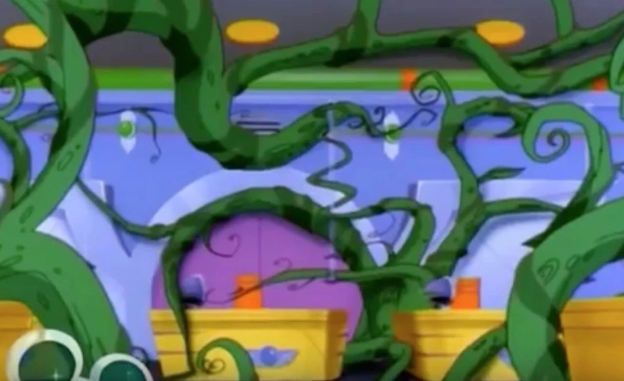 Mira and Booster run back to the report room, but are ensnared by the vines and dragged inside. Above them in the air vents, XR is leading the children through, and the shortest alien boy exclaims in delight upon seeing Booster and Mira. He asks them to smile as he takes a flash photo of them, and before Mira can demand what the child is doing, the plant reacts violently to the flash, electrocuting Mira and Booster. The child is dumbfounded, but XR grabs him, not noticing the plight Booster and Mira are in. Thankfully, after a little, the plant's roots fall to the ground, leaving Mira and Booster still tangled, but alive and well. Mira wonders how the plant has so much electrical power when Triffid said otherwise, but Booster evades the question as they disentangle themselves and receive another angry call from Buzz to get to the briefing room.