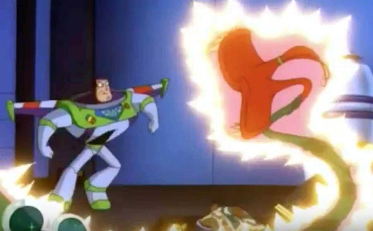After XR leads the children to the laundry room and then a random closet, they start complaining at how weird and lame the tour is. He lies and says this room is a mini movie theater and starts up some recordings to show them, claiming it is Buzz's favorite show. However, most of them involve him getting blown up on planets like Trade World, Sentilla 6 and Karn while vines silently ensnare the children one-by-one and drag them away, and eventually grab XR too once he finds the children missing.